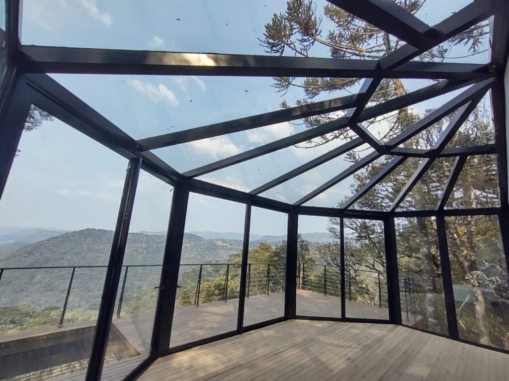 O projeto se destaca pela sua arquitetura única, onde o vidro assume papel protagonista ao criar um ambiente totalmente integrado à paisagem natural ao redor. A utilização de vidro insulado garante não apenas máxima transparência e valorização da vista panorâmica, mas também conforto térmico e acústico, essencial para esse tipo de aplicação.